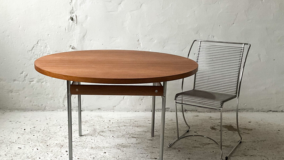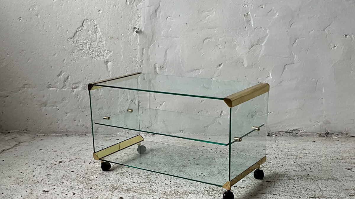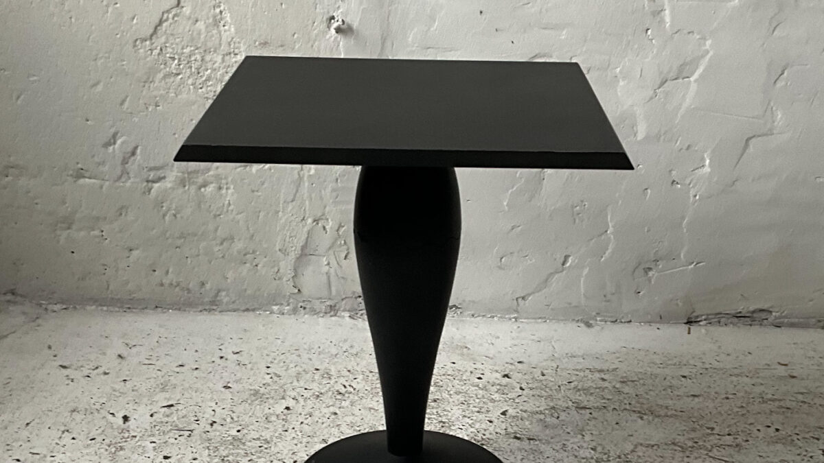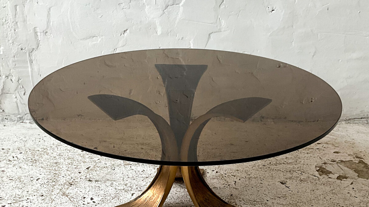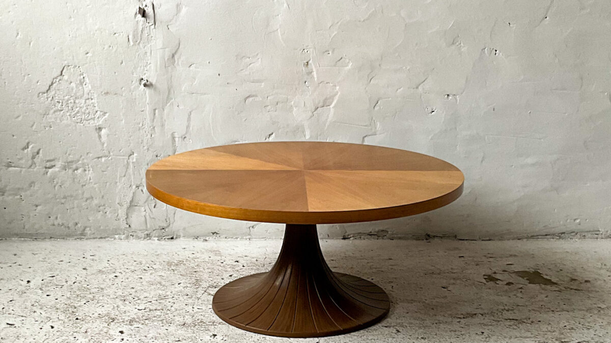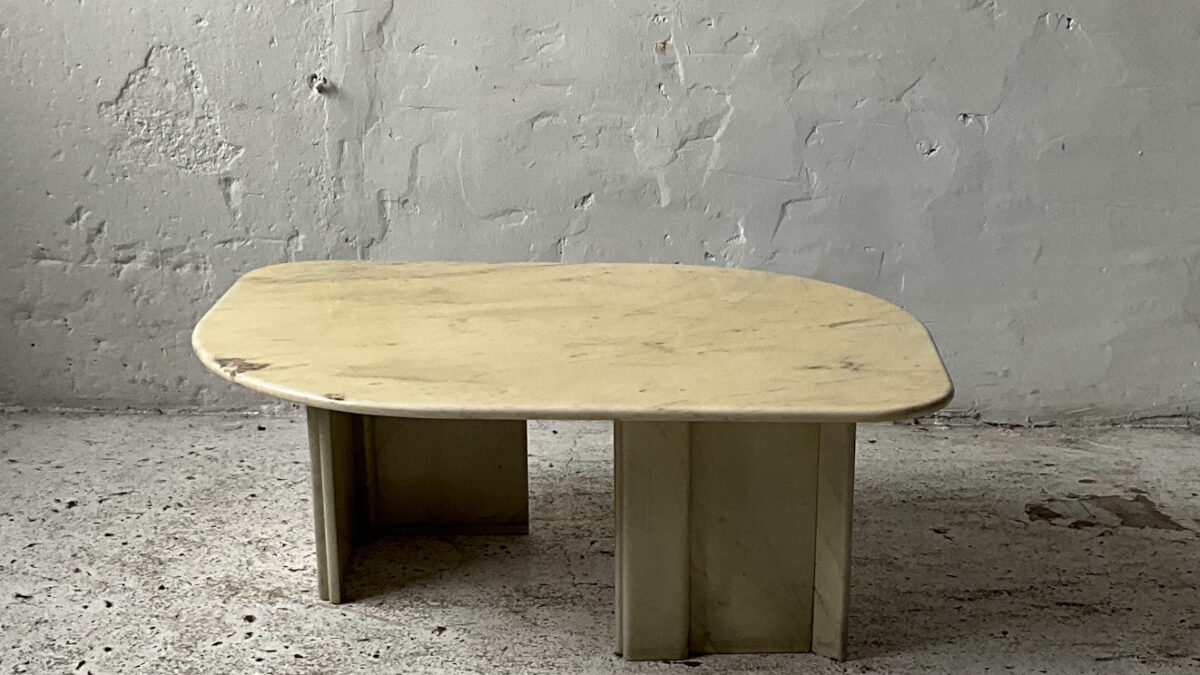Stolik z lat 70/80-tych na podstawie z drewna orzecha włoskiego z trawertynowym blatem. Stolik jest masywny, bardzo interesujący estetycznie, świetnie wykonany z dbałością o detal. Stan zachowania jest dobry ze śladami użytkowania właściwymi dla wieku tego mebla.