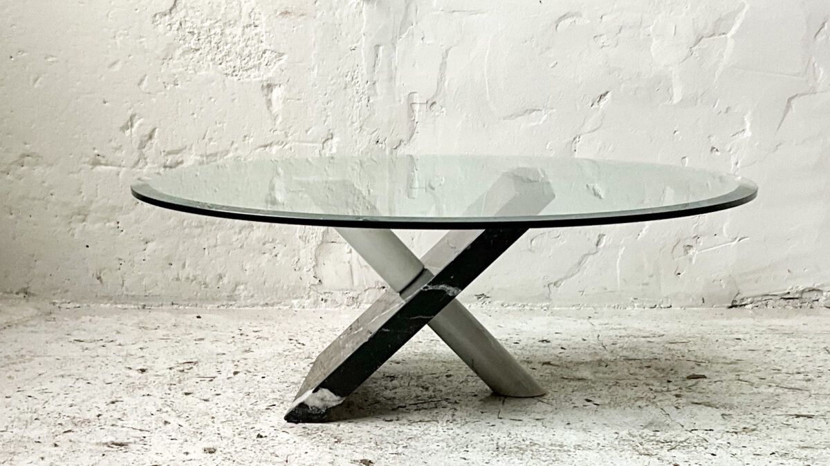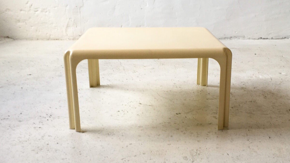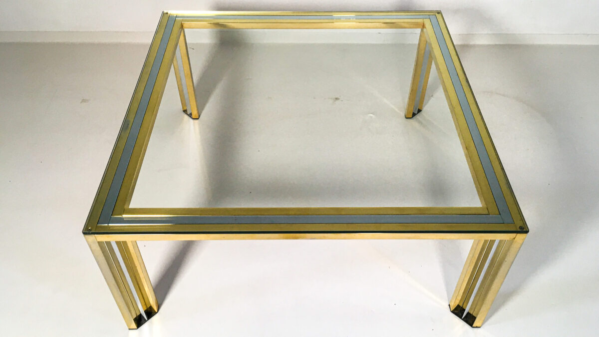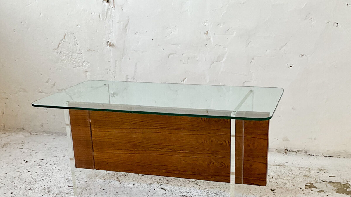 Stolik kawowy z lat 70-tych. Blat stolika jest szklany konstrukcja wykonana jest z płyty fornirowanej palisandrem oraz akrylu. Jest to interesujące estetycznie połączenie, stolik jest zgrabny i atrakcyjny wizualnie. Stan zachowania stolika jest dobry ze śladami użytkowania właściwymi dla jego wieku.
