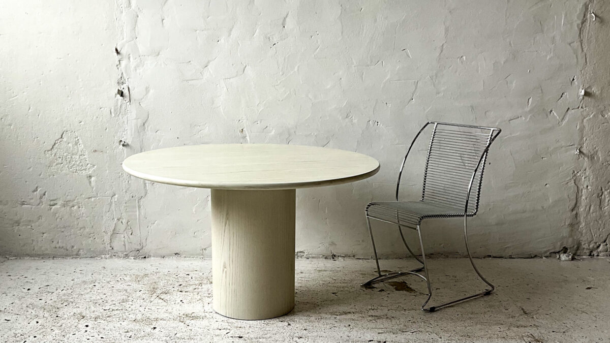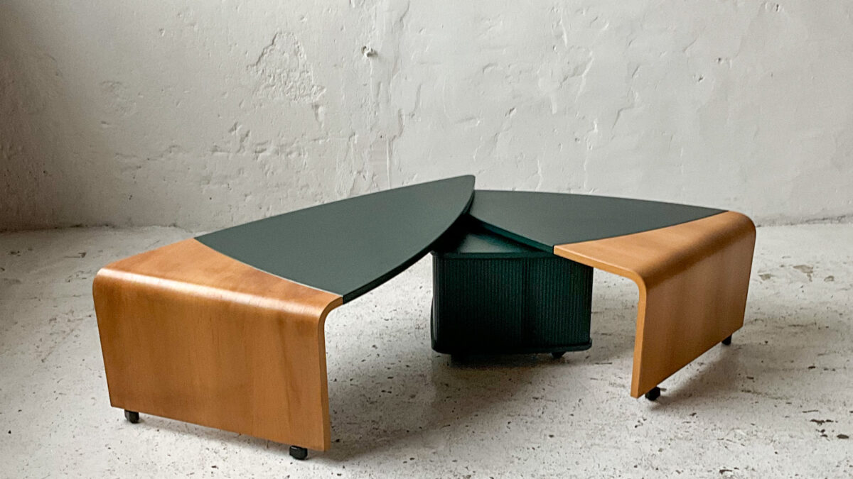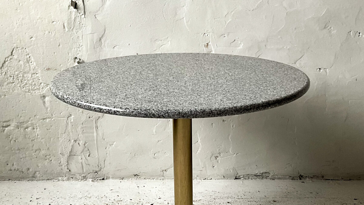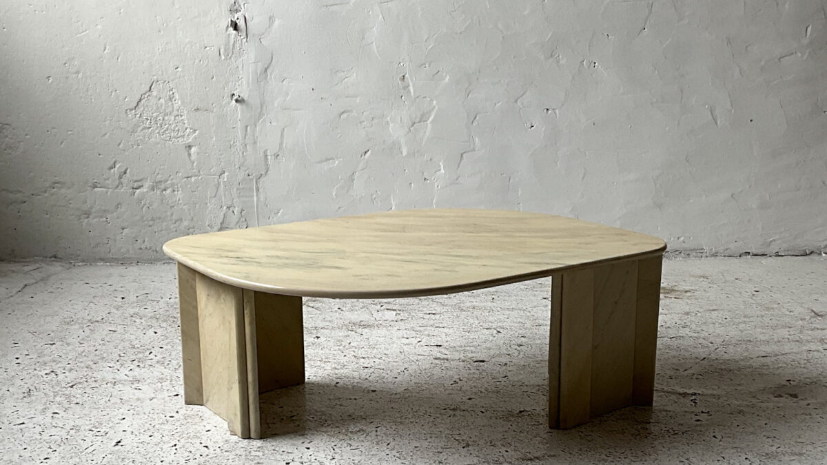 Stolik kawowy z lat 70-tych. Blat stolika jest szklany konstrukcja wykonana jest z płyty fornirowanej palisandrem oraz akrylu. Jest to interesujące estetycznie połączenie, stolik jest zgrabny i atrakcyjny wizualnie. Stan zachowania stolika jest dobry ze śladami użytkowania właściwymi dla jego wieku.