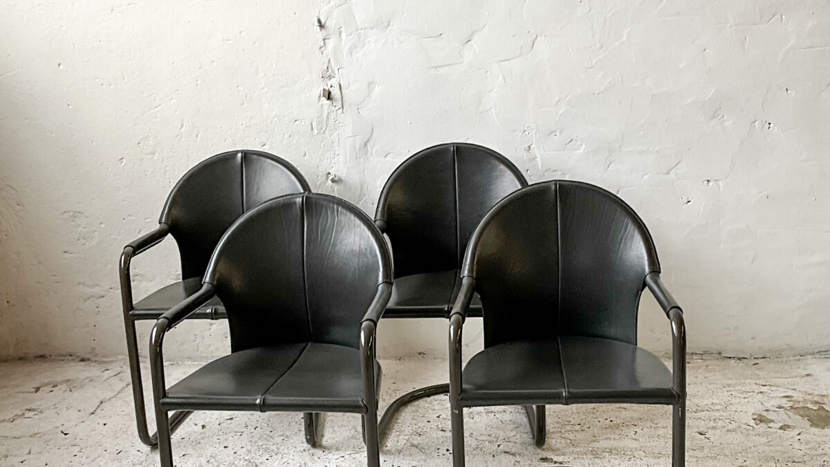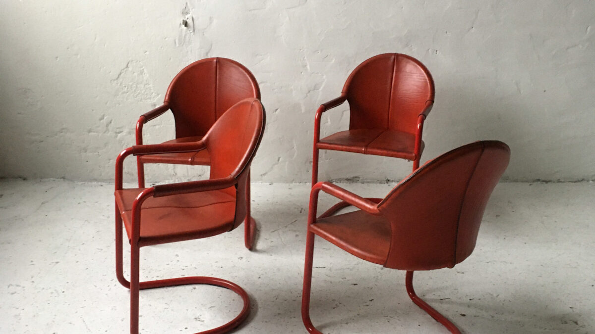 Włoskie krzesła modernistyczne wyprodukowane przez firmę Polflex. Krzesła są wygodne dzięki swej lekko pracującej konstrukcji. Siedziska wykonane są z wysokiej jakości, grubej skóry siodłowej. Stan zachowania krzeseł jest dobry ze śladami użytkowania właściwymi dla ich wieku. Posiadamy większą ilość tych krzeseł.