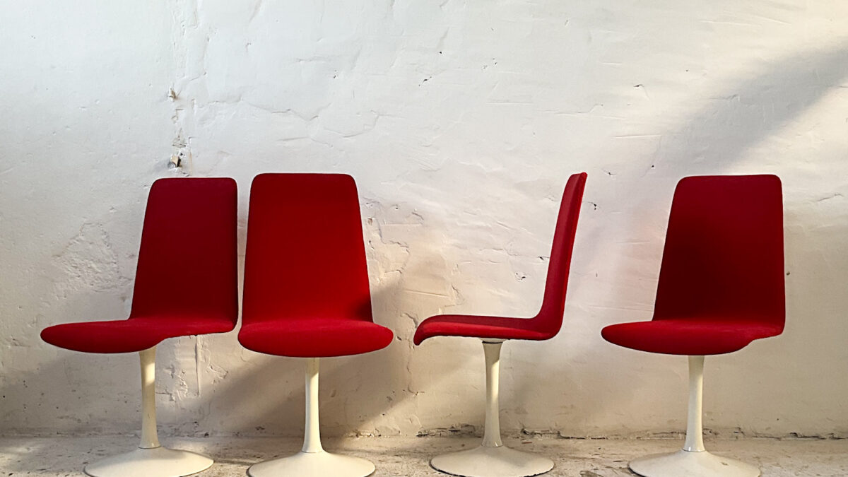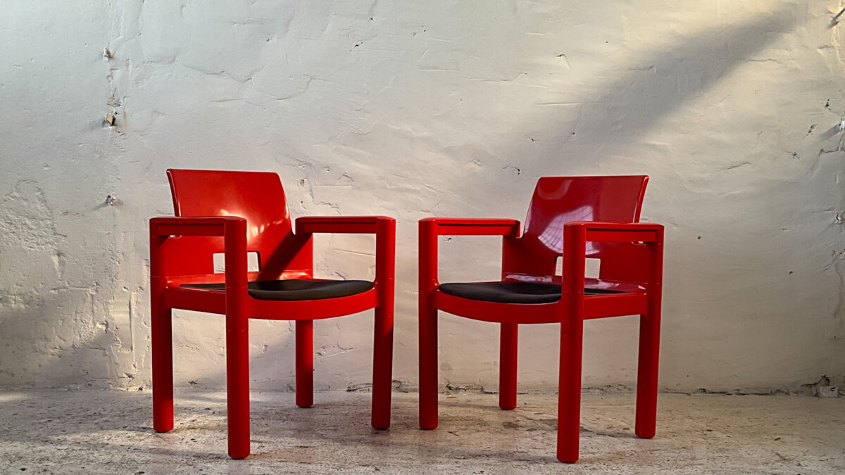 Krzesła pochodzące z lat 70/80-tych i wyprodukowane przez niemiecką firmę Kusch & Co. Projekt nawiązuje do estetyki memphis. Krzesła są nie tylko atrakcyjne wizualnie ale również bardzo wygodne. Stan zachowania jest dobry ze śladami użytkowania właściwymi dla wieku tych mebli. Posiadamy większą ilość tych krzeseł.