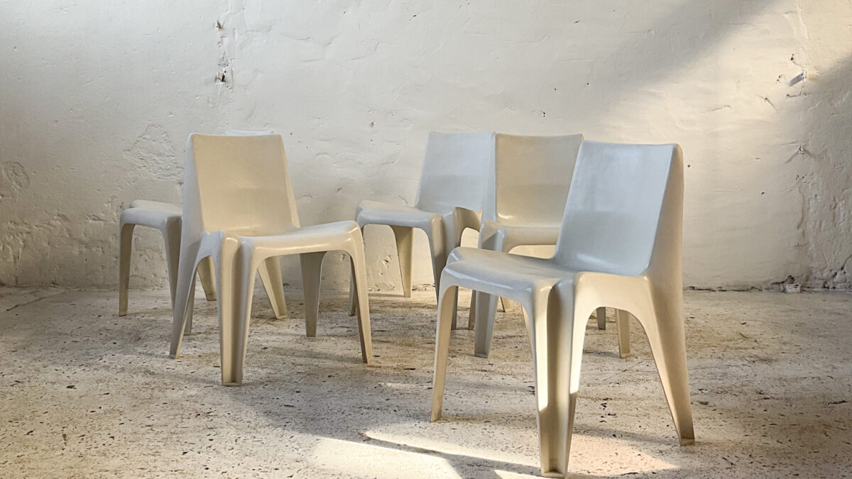 Krzesła BA1171 zaprojektowane zostały w 1964r. przez Helmuta Bätznera dla niemieckiej firmy Bofinger. Jest to przełomowy w historii wzornictwa projekt – pierwsze krzesła z tworzywa sztucznego w całości tłoczone. Materiał to poliester wzmacniany włóknem szklanym. Krzesła można sztaplować, ze względu na swą ergonomię stały się pierwowzorem dla wielu późniejszych projektów mebli ogrodowych. Krzesła są w stanie oryginalnym, stan jest dobry ze śladami używania właściwymi dla ich wieku.