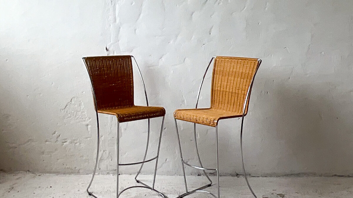 Hokery z lat 90-tych wyprodukowane przez niemiecką firmę Meyer Metalstuhl. Hokery dzięki swej konstrukcji lekko sprężynują i bujają się co bardzo korzystnie wpływa na komfort użytkowania. Hokery są stalowe, chromowane, siedziska wyplatane wikliną. Hokery są bardzo dobrze wykonane i zaskakująco wygodne. Stan zachowania jest dobry ze śladami użytkowania właściwymi dla wieku tych mebli.