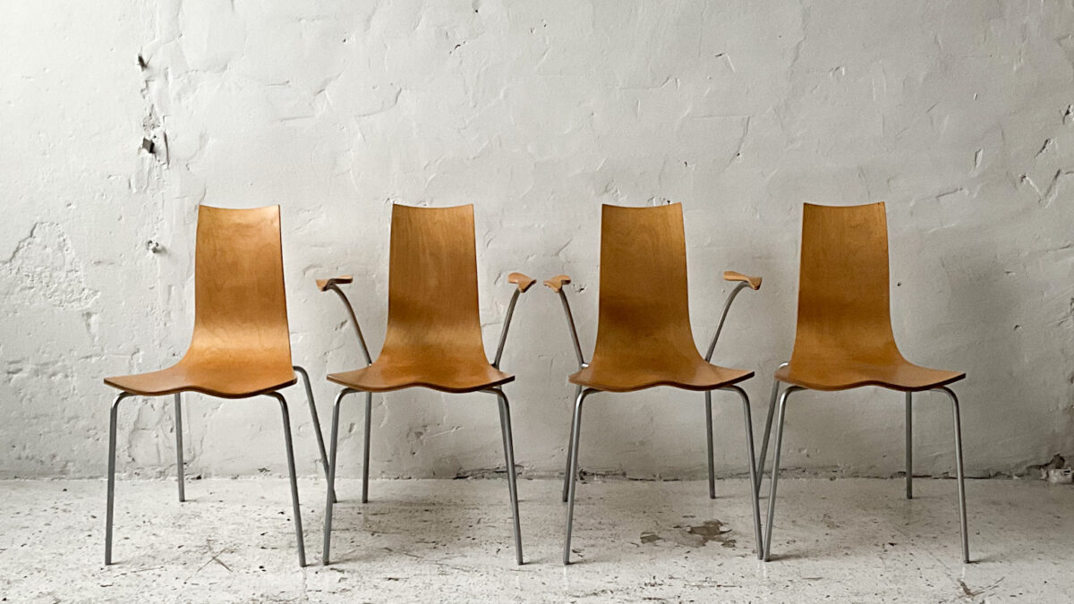 Krzesła Parlando to projekt z lat 1999r. niemieckiej marki Drabert. Krzesła są wygodne, dobrze zaprojektowane i wykonane. Krzesła można sztaplować. Stan zachowania jest dobry ze śladami użytkowania właściwymi dla wieku tych mebli.