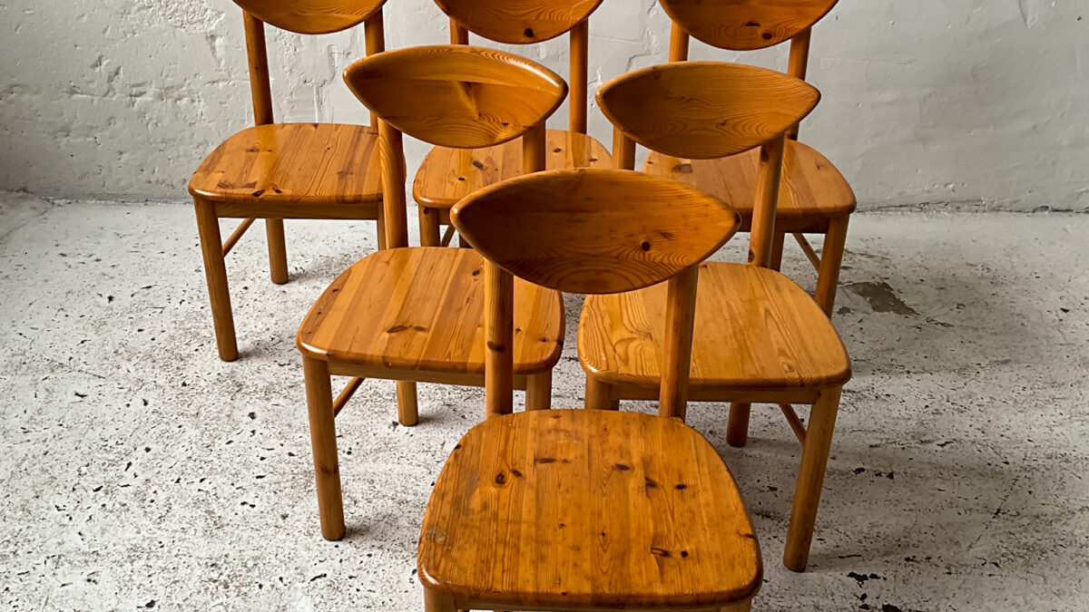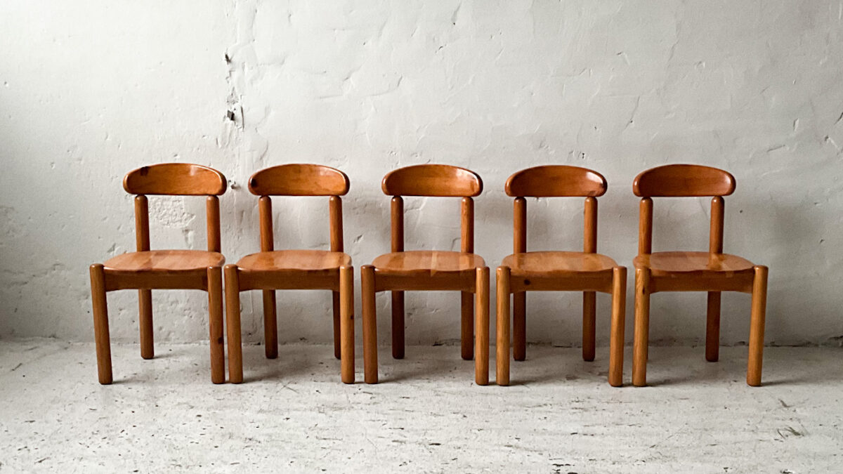 Duńskie krzesła z lat 70-tych zaprojektowane przez Rainera Daumillera. Krzesła są bardzo wygodne, masywne i dobrze wykonane. Materiał to drewno sosnowe. Stan zachowania krzeseł jest dobry ze śladami użytkowania właściwymi dla wieku tych mebli.