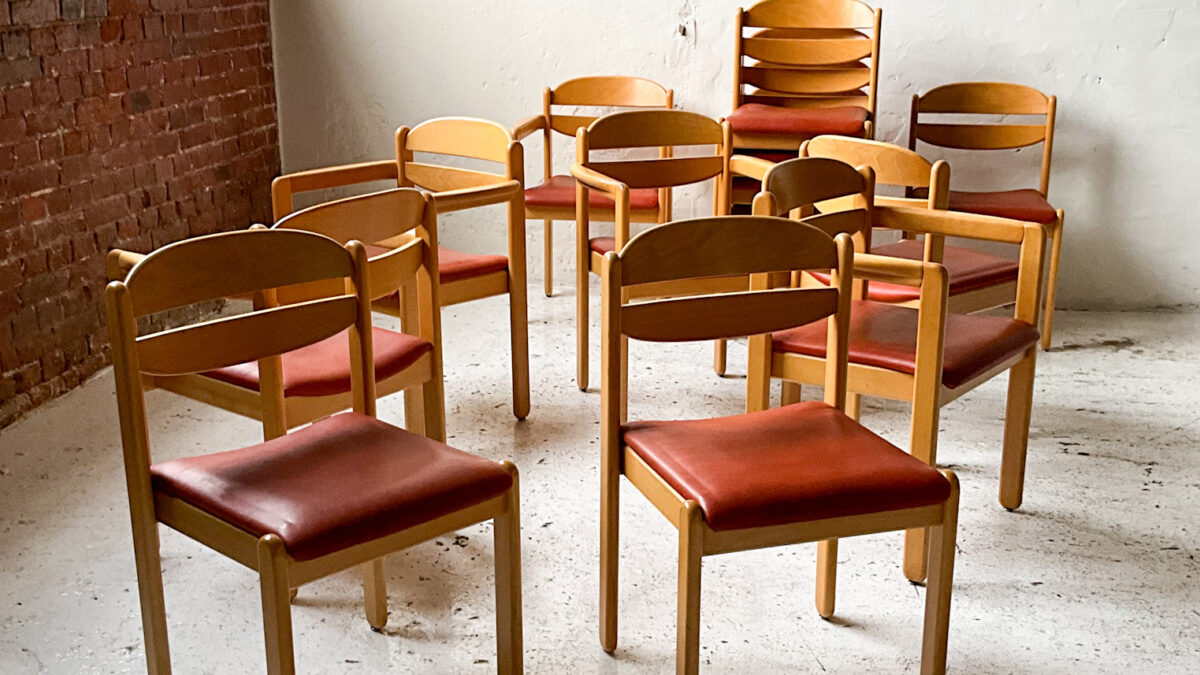 Duńskie krzesła z lat 70/80-tych z drewna bukowego. Solidna, stabilna konstrukcja, wygodne siedziska. Krzesła są dobrze wykonane i zaprojektowane, można je sztaplować. Obicie siedziska to wysokiej jakości skaj. Stan zachowania jest dobry ze śladami użytkowania właściwymi dla wieku tych krzeseł.