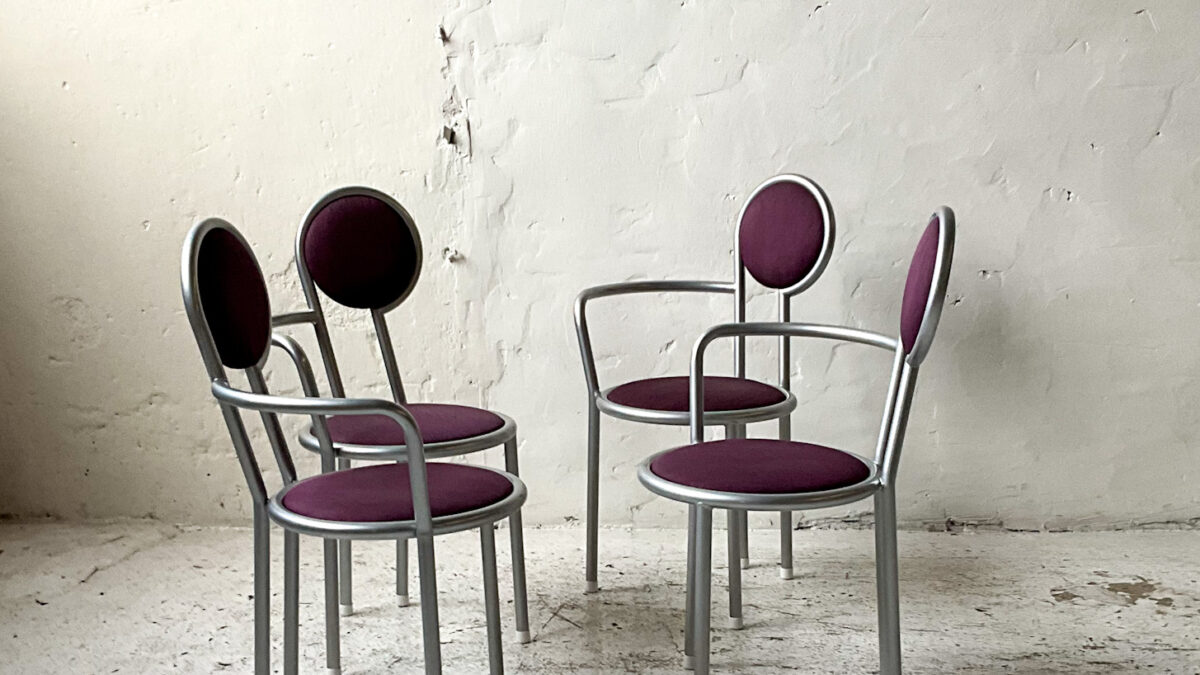 Krzesła z lat 80/90-tych utrzymane w estetyce memphis style. Krzesła są wygodne, dobrze wykonane i atrakcyjne estetycznie. Konstrukcja krzeseł to malowana stal, siedziska to tworzywo. Stan zachowania krzeseł jest dobry ze śladami użytkowania właściwymi dla wieku tych mebli.