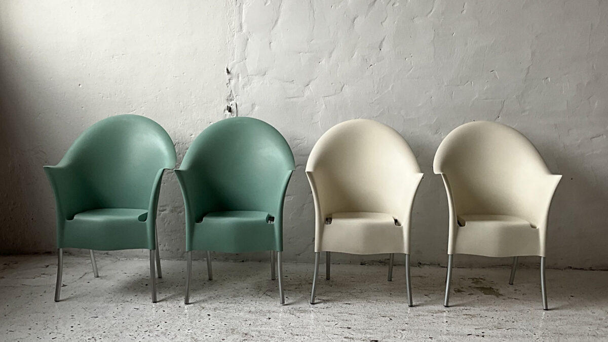 Krzesła Lord Yo zaprojektowane w 2006r. przez Philippe Starcka dla włoskiej firmy Draide. Krzesła w kolorze kości słoniowej, bardzo ergonomiczne i praktyczne – z możliwością sztaplowania. Stan zachowania dobry ze śladami użytkowania właściwymi dla wieku tych krzeseł.