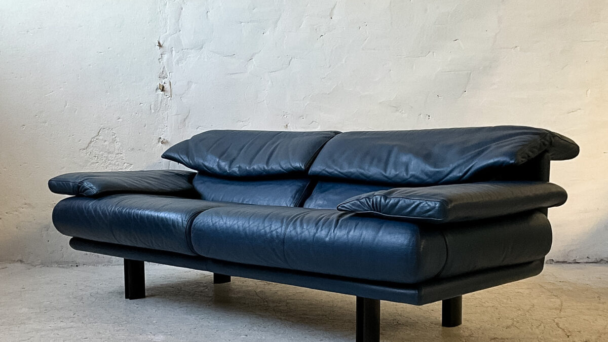 Sofa Alanda to projekt Paolo Piva z lat 80-tych dla włoskiej firmy B&B Italia. Sofa jest dobrym przykładem estetyki lat 80-tych. Konstrukcja aluminiowa, wysokiej jakości skórzana tapicerka w kolorze granatowym. Zagłówki i podłokietniki ruchome – można je ustawić w kilku pozycjach. Całość bardzo wygodna i atrakcyjna wizualnie. Sofa jest zachowana w dobrym stanie ze śladami użytkowania właściwymi dla wieku tego mebla.