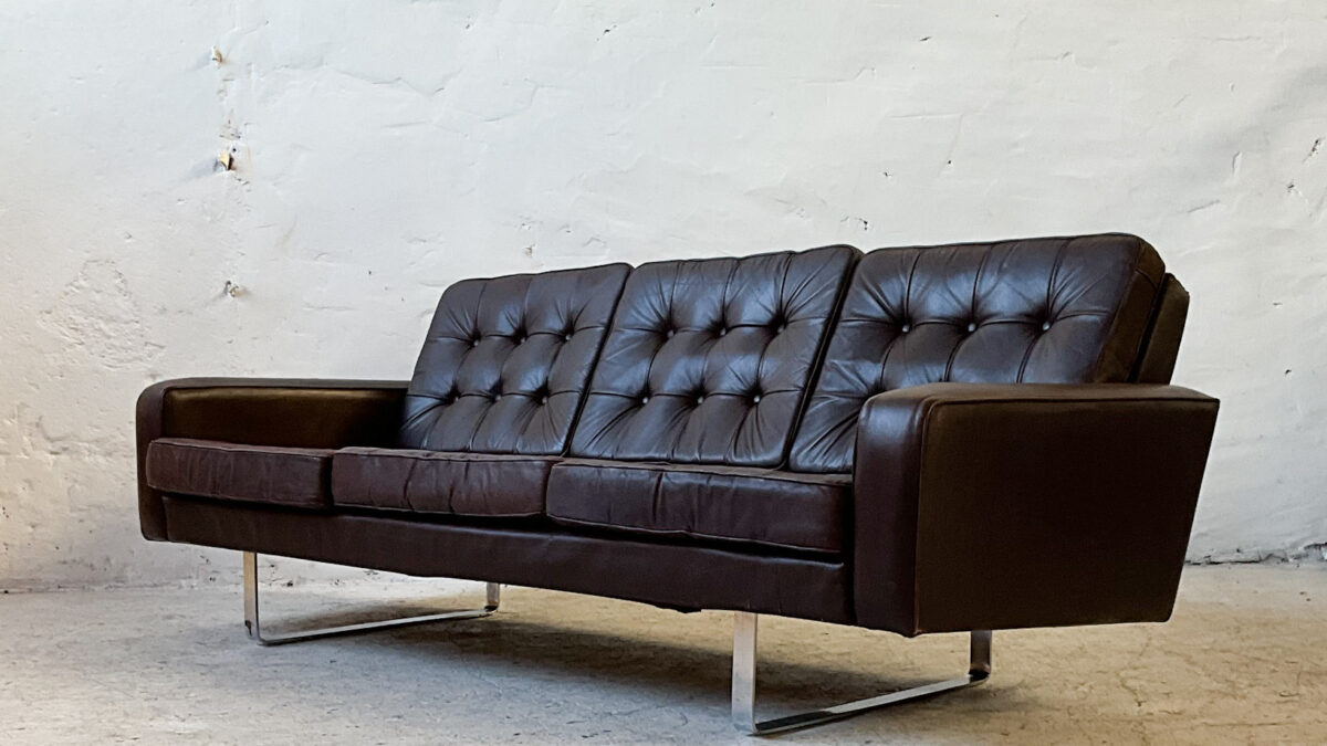 Sofa z lat 60/70-tych, klasyczny dla estetyki mid century modern projekt. Sofa jest bardzo wygodna, świetnie zaprojektowana i bardzo dobrze wykonana z wysokiej jakości materiałów. Stan zachowania jest dobry ze śladami używania właściwymi dla wieku tego mebla. Nogi wykonane są z chromowanej stali, siedziska to dobrej jakości skóra. Całość bardzo atrakcyjna wizualnie.