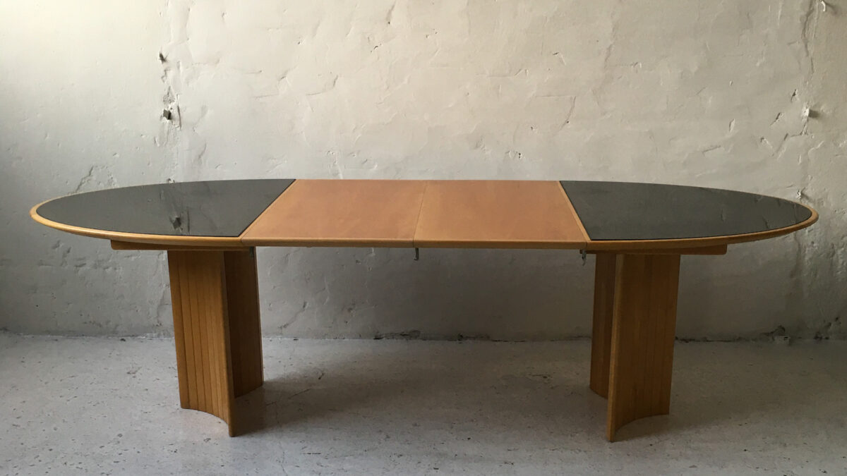 Rozkładany stół z granitowym blatem z lat 80/90-tych. Stół jest świetnie wykonany z bardzo dobrej jakości materiału. Konstrukcja stołu jest drewniana. Stan zachowania jest dobry ze śladami użytkowania właściwymi dla wieku tego mebla (blat ma jeden, drobny uszczerbek – widoczny na zdjęciu).