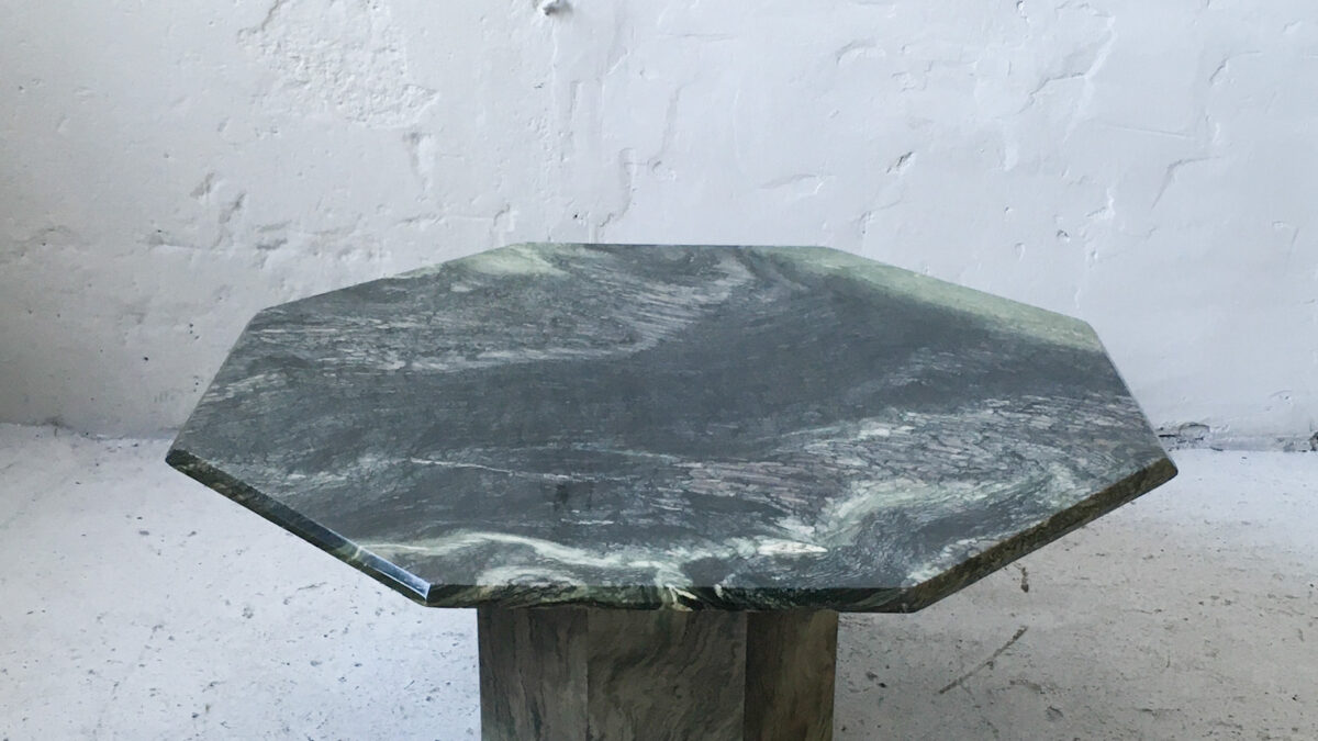 Stolik z lat 70/80-tych wykonany z marmuru cippolino ondulato. Bardzo atrakcyjny rysunek kamienia, dobre wykonanie. Stan zachowania jest dobry ze śladami użytkowania właściwymi dla wieku tego mebla. Stolik jest dość ciężki i masywny.