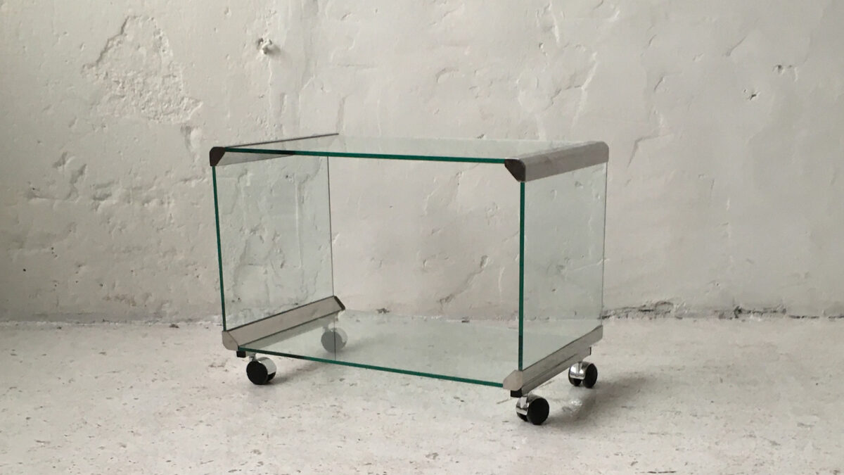 Stolik George to projekt z lat 70-tych Pierangelo Gallotti dla włoskiej marki Gallotti&Radice. Szklane elementy łączone są chromowanymi łącznikami. Forma dość lekka i przyjemna dla oka. Stan zachowania stolika jest dobry ze śladami użytkowania właściwymi dla wieku tego mebla.