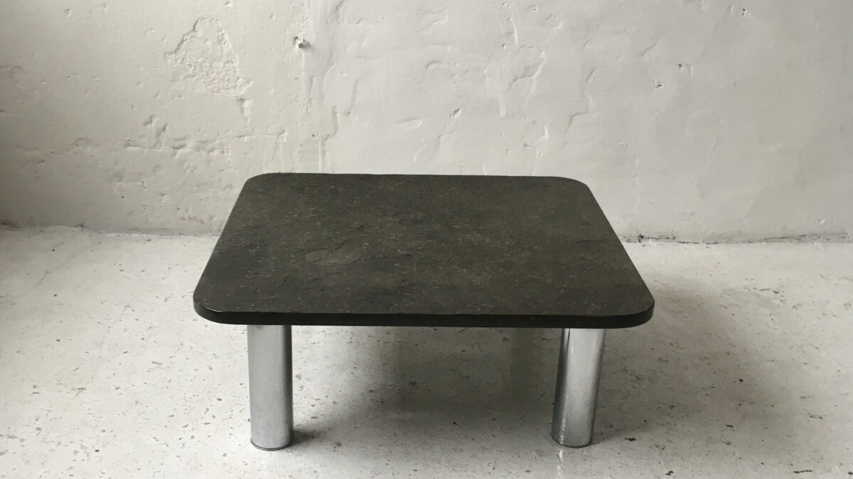 Stolik kamienny z łupków lata 80/90-te. Blat spoczywa na masywnych, chromowanych nogach. Na blacie widoczny skamienielina (amonit). Całość bardzo interesująca estetycznie, nieco brutalistyczna. Stan zachowania jest dobry ze śladami użytkowania właściwymi dla wieku tego mebla.