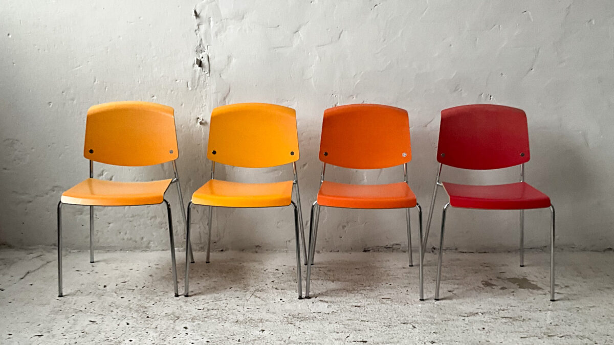 Krzesła z lat 80/90 wyprodukowane przez duńską firmę Magnus Olesen. Krzesła są wygodne, dobrze wykonane i bardzo ergonomiczne. Krzesła można sztaplować. Stan zachowania krzeseł jest dobry ze śladami użytkowania właściwymi dla wieku tych mebli.