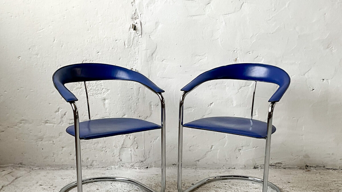 Włoskie krzesła modernistyczne z lat 80/90-tych. Krzesła są bardzo wygodne dzięki lekko pracującej konstrukcji. Siedziska wykonane są z bardzo dobrej jakości skóry siodłowej. Stan zachowania krzeseł jest dobry ze śladami użytkowania właściwymi dla ich wieku. Krzesła sprzedajemy w parzystych zestawach.