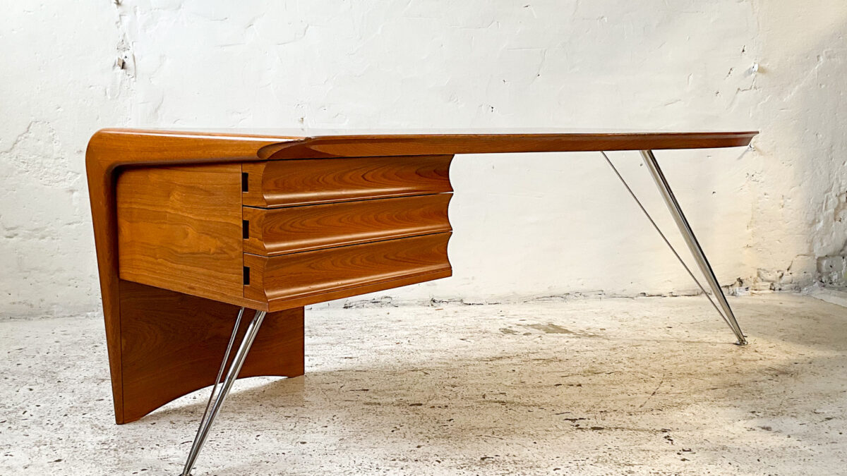 Prezentowane biurko fornirowane jest wysokiej jakości mahoniem. Forma, wykonanie i użyte materiały są najwyższej klasy. Jest to wysokiej próby design połączony ze znakomitym rzemiosłem. Projekt w każdym detalu wybitny. Powstała krótka seria – prezentowane biurko oznaczone jest numerem 6.