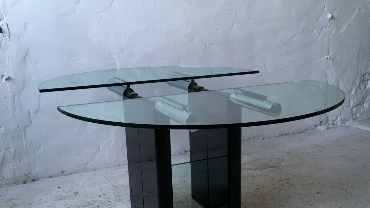 Szklany stół jadalniany z lat 80/90-tych. Stół jest świetnie zaprojektowany i wykonany. Podstawa lakierowana na czarno, łączona szklanym elementem. Blat spoczywa na chromowanych mechanizmie, jest rozsuwany (wkładki brak – należałoby ją dorobić). Stan zachowania jest dobry ze śladami użytkowania właściwymi dla wieku tego mebla (jest miejscowy odprysk na chromowanym mechanizmie).