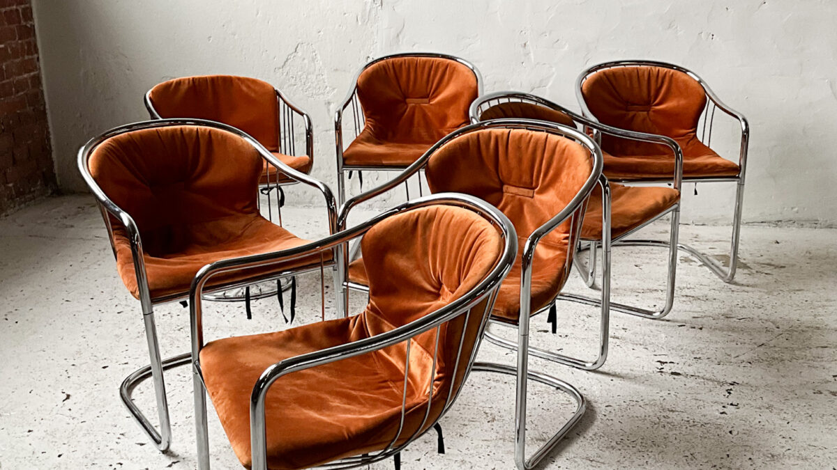 Krzesła z lat 80/90-tych zaprojektowane przez Gastone Rinaldi. Krzesła są bardzo atrakcyjne wizualnie i świetnie wykonane. Krzesła dzięki swej lekko pracującej konstrukcji są bardzo wygodne. Stan zachowania jest dobry, obicie było w ostatnich latach wymieniane.