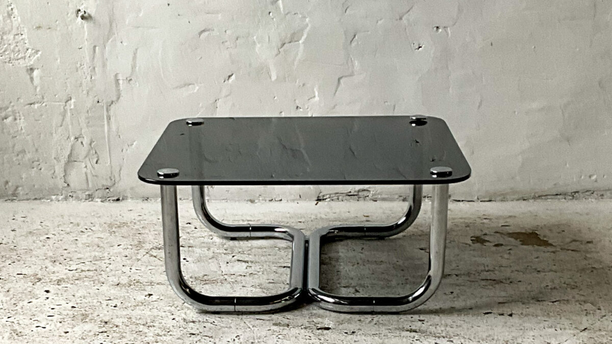 Stolik kawowy z lat 70/80-tych. Konstrukcja stolika to chromowana stal, blat jest szklany. Stolik jest atrakcyjny wizualnie, dobrze wykonany z dbałością o detal. Stan zachowania jest dobry ze śladami użytkowania właściwymi dla wieku tego mebla.