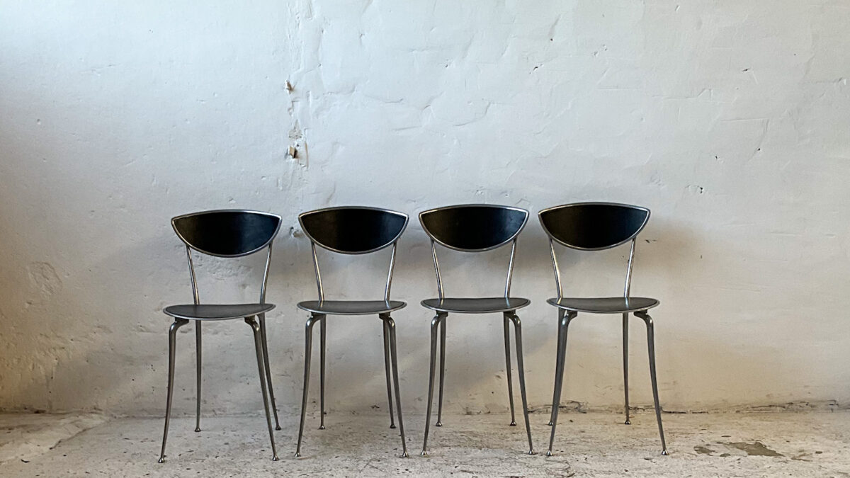 Krzesła aluminiowe zaprojektowane w latach 90-tych, wyprodukowane przez włoską firmę Arper. Jest to dość rzadki i poszukiwany na rynku projekt. Krzesła są niezwykle zgrabne, świetnie wykonane z dbałością o detal i przy tym wygodne. Stan zachowania jest dobry ze śladami użytkowania właściwymi dla wieku tych krzeseł.