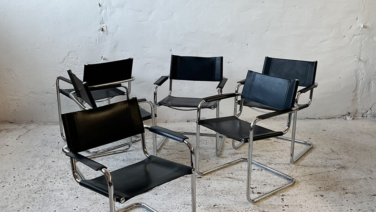 Klasyka estetyki bauhaus – krzesła zaprojektowane w latach 20-tych przez Marta Stama. Do dziś trwa nierozstrzygnięta dyskusja kto pierwszy zaproponował tego rodzaju konstrukcję krzesła – Marcel Breuer czy Mart Stam. Jedno nie ulega wątpliwości – koncept jest ponadczasowy. Krzesła są nie tylko zgrabne ale również bardzo wygodne. Krzesła zachowane są w stanie dobrym ze śladami użytkowania właściwymi dla ich wieku. Siedziska wykonane są z wysokiej jakości skóry siodłowej w kolorze czarnym.
