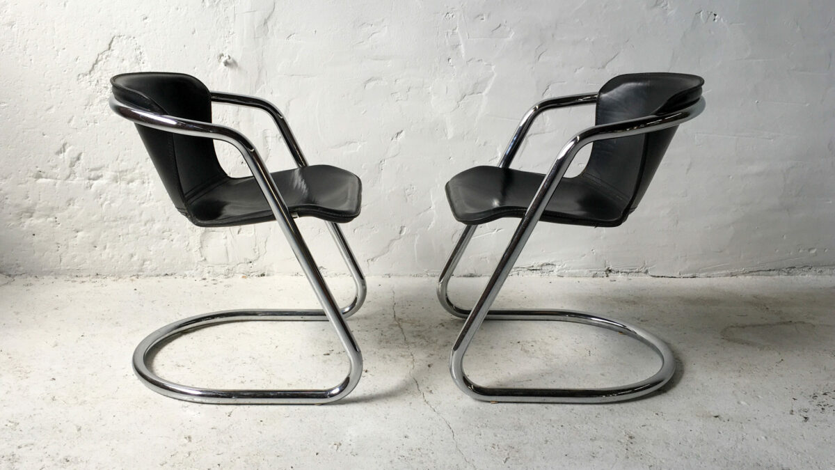 Włoskie krzesła składane z lat 70/80-tych utrzymane w stylistyce projektów Arrben. Krzesła są bardzo ergonomiczne, świetnie zaprojektowane i wykonane z dbałością o detal z wysokiej jakości materiałów. Konstrukcja krzeseł jest chromowana, siedziska są skórzane. Stan zachowania krzeseł jest bardzo dobry. Sprzedajemy krzesła wyłącznie w zestawach parzystych.